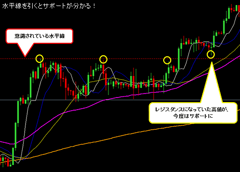 では、順序がやや前後してしまいますが、レジスタンス・サポートとして使うという点で共通している4番目の「水平線」もいっしょにご紹介したいと思います。