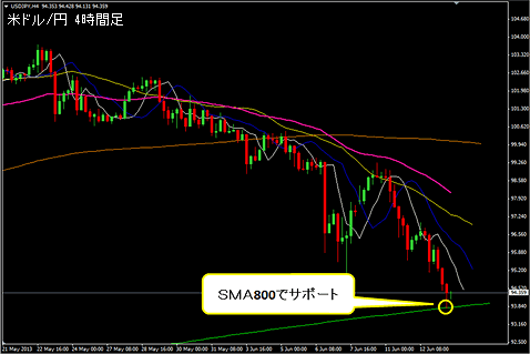 というわけで、実際に直近のチャートでレジスタンス・サポートとして機能しているものを探してみたところ、2013年6月13日(木)の米ドル/円の95円割れの下落が、4時間足のSMA800でピッタリサポートされているのを発見しました。