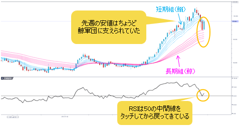 先週(6月10日~)の安値は、ちょうど鯨軍団に支えられていたことが確認できるうえ、RSIも50の中間線をタッチしてから戻ってきている。