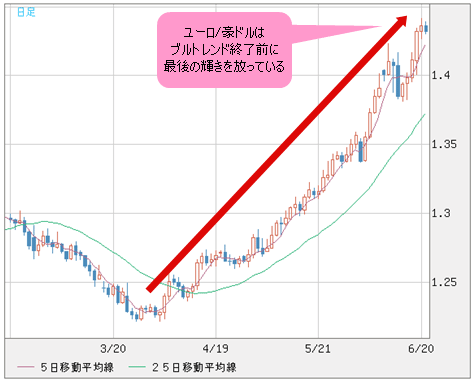 5月23日(木)前後における米ドル/円と日経平均の強気ムードと同様、ユーロ/豪ドルは最後の「輝き」を放っているだけに、もっとも目がくらむ存在だ。