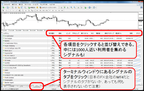 FXの上手な人が自分の取引をシグナルとして公開することができます。シグナルを公開すると、その人の履歴や取引が公開され、その人と同じ売買をしたいと思ったら口座を連動させて自動的に同じ取引をさせることもできるんです」