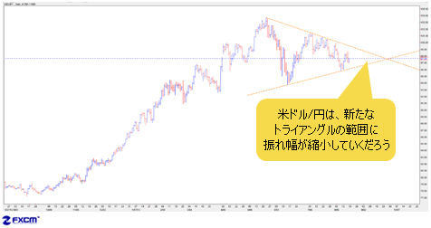 米ドル/円に関しては目先、振れ幅が縮小していく可能性に注目したい。従来のトライアングルのレンジ範囲から、以下のように、新たに描かれたトライアングルの範囲に留まるではないかと思う。