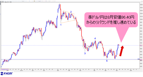 まず、上のチャートで示しているよう、4月高値105.43円からの下落波は、きれいな5波構造を形成し、8月28日(水)安値、8月7日(水)安値を更新できず、5波構造を持つ下落波の完成を示唆していた。要するに8月安値86.40円からリバウンドの展開を推し進めているということだ。