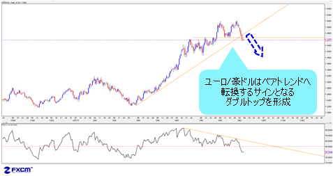 まず注目されるユーロ/豪ドルは、しっかりしたダブルトップを形成し、これからベアトレンドを推進していくサインを灯していることがわかる。