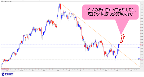 次に、1-2-3の法則で測る底打ち、至って反騰の公算も大きいから、豪ドル/円のリバウンドは、当面起こりやすいとみる。