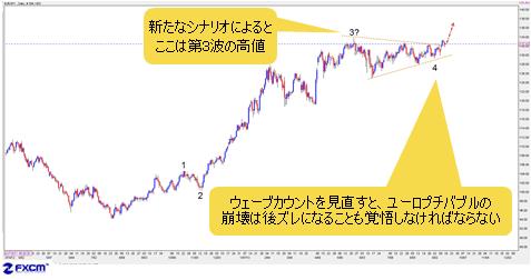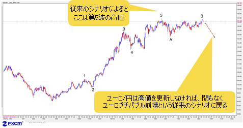 考えられるもう1つのシナリオ、つまり、ユーロプチバブルの崩壊が規定路線となり、これからも続く場合は、ユーロ/円は結局高値を更新せず、反落してくることになる。この場合、下のチャートに記しているように、従来のシナリオに復帰する。