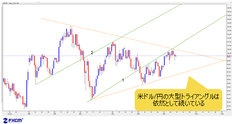 前回のコラムで指摘したとおり、米ドル/円の上値は限定的で、しばらく大型トライアングル型変動パターンにとどまる。足元の相場から考えて、こういった状況がなお継続していることがおわかりいただけるだろう。