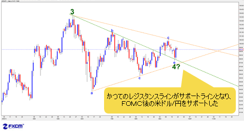米ドル/円に関する予測はFOMCの決定によって間違いになったが、基本構造は変わっていないので、現時点のチャートと照らしてご覧をいただければ、より理解できると思う。