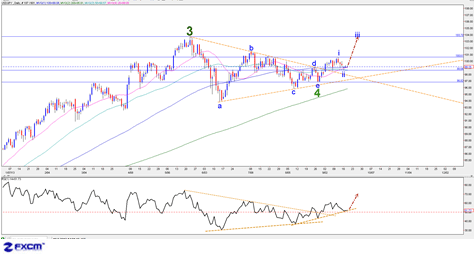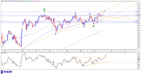 筆者注:ユーロ/円と英ポンド/円は、現在なお上昇波のiii子波に位置しているとみる。また、米ドル/円は、上昇波の最初の子波iに位置していると思う。