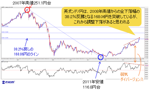 英ポンド/円の状況も似ている。英ポンド/円は2008年高値を起点とした全下落幅に対する38.2%反騰位置の168.06円を突破しているが、RSIで2月高値か ら構築されてきた弱気ダイバージェンスのサインが煮詰まりつつあり、これがいつ効いてきてもおかしくなかろう。