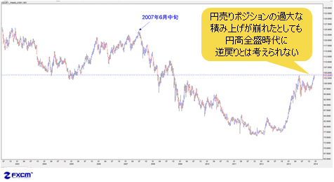 当然のように、2007年後半から始まったベアトレンドは、サイクルの後半、つまり下げ局面に沿った値動きで、現在位置するサイクル上の位置と大きく異なるから、円売りポジションの過大な積み上げが仮に崩れたとしても、また円高全盛時代に逆戻りするとは考えられない。