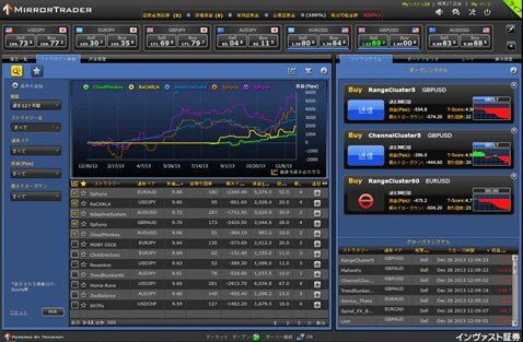 「ミラートレーダー」は、あらかじめ搭載されたストラテジーを選ぶだけで、誰でも自動売買ができる! ということで、シストレ初心者にも人気のプラットフォーム。現在、日本国内ではインヴァスト証券「シストレ24」をはじめ、7つのFX会社で利用することができます。
