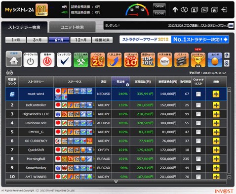 そんなインヴァスト証券[シストレ24]では、2013年末に「ストラテジーアワード2013」という年間No.1ストラテジーを決定するイベントを開催。「ザイFX!TV(原宿)」にて、その授賞式が行われました! 見逃したと言う方は、ぜひ【参考コンテンツ】から録画放送をご覧くださいね。