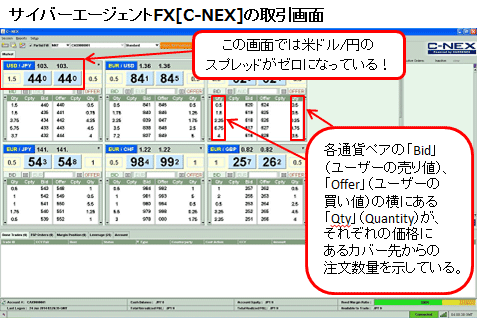これからカレネックスがもっと普及すると、板を利用したトレーダーなども出てくるだろうし、板をざっと眺めているだけでも、銀行がどのあたりのレートへ多めに注文を出しているかなと、節目が読めるようなこともあるかもしれない。