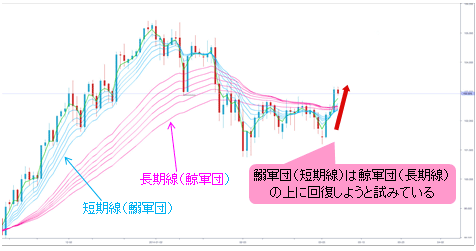 前回のコラムでGMMAチャートで見た米ドル/円の日足を再度見ると、鰯軍団(短期線)が鯨軍団(長期線)の上に回復しようとする試みは明白だ。2013年年末から日足で初めて「三連陽」が形成され、一段と切り返しの余地を拓く可能性が示唆されている。