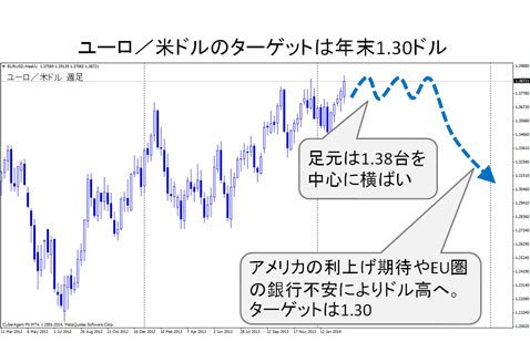 「ほかにもECBでは政策金利をゼロ以下に引き下げる『マイナス金利』の導入など、金融緩和がささやかれていますし、ユーロ圏の銀行の資産内容を精査する『AQR』も予定されています。どちらもユーロ安の材料となりうるものなので、ユーロ/米ドルは春以降、1.30へ向けて下落するのではと見ています」