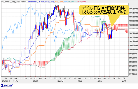 この発表後、米ドル/円は一気に102.68円まで急騰しましたが、日足の一目均衡表のレジスタンスが密集している102円台ミドルで上げ渋り。