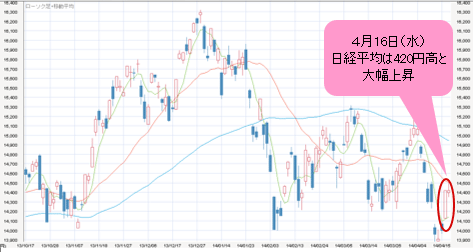 このコメントを受けて、4月16日(水)の日経平均は420円高と大幅上昇。連れて、米ドル/円も102円台を回復しました。