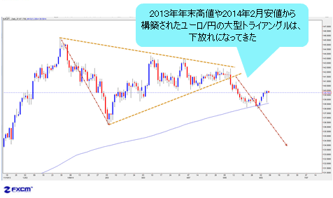 まず、昨年(2013年)年末高値や今年(2014年)2月安値から構築された大型トライアングルは、ちまたの大半の予想だった上放れではなく、下放れになってきた。したがって、同フォーメーションの下放れ後のターゲットは達成されやすいとみる。