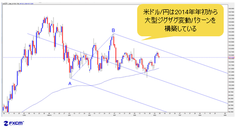 では、米ドル/円の2014年年初から構築された構造とは何か。簡単なイメージとなるが、下のチャートが示すように、大型ジグザグ変動パターンである。