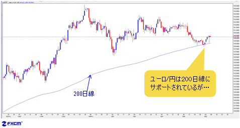 ところで、ユーロ/米ドルの下げ一服がユーロ/円の下げ一服にもつながり、目下200日移動平均線(200日線)のサポートが明白になっている。
