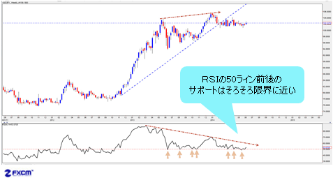 次に、2014年3月28日(金)の本コラムで説明したように、週足におけるRSIが示す大型ダイバージェンスが効くかどうかは、これからRSIが50のラインを切るかどうかにかかっている。