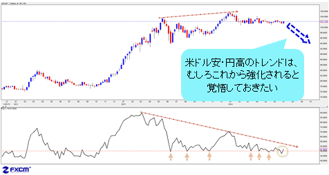 また、たびたび提示していた米ドル/円週足におけるRSIの弱気ダイバージェンスのチャートも、米ドル安・円高の継続を示唆。