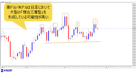 豪ドル/米ドルについては、昨日(7月24日)、一時0.9473ドルまで上昇したものの、結局、陰線引けで、日足における大型「複合型三尊(※)」の可能性を強化しているように見える。