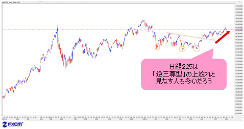また、日経225については下のチャートに記しているように、「逆三尊型(※)」の上放れと見なす人も多いだろう。