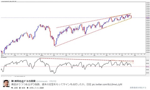 NYダウを例に挙げてみると、7月27日(日)に筆者のツイッターで下記のチャートを掲示していたが、最新のチャートと見比べれば、NYダウの頭打ちは一目瞭然だ。