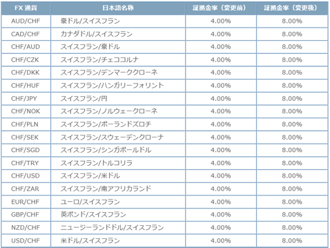 スイスフラン絡みの通貨ペアで証拠金率引き上げの動きも