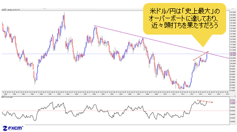 そして、肝心の米ドル/円は前回の指摘と同様、メインレジスタンスゾーンをトライしているが、「史上最大」のオーバーボートに達しており、近々頭打ちを果たすだろう。