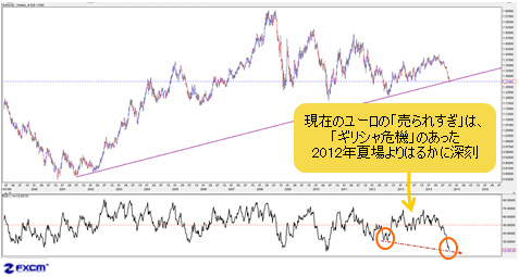 注意すべきなのは、RSIの数値で見るとわかるように、ユーロの「売られすぎ」は、実は2012年夏場の時期よりはるかに深刻ということだ。あの時は世が言う「ギリシャ危機」や「ユーロ崩壊」の時期だったことから考えると、目下のユーロ安がいかにオーバーしているかがわかる。