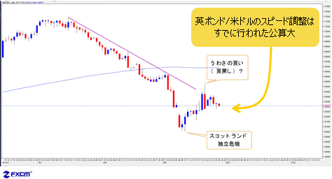 スコットランド独立投票の騒ぎで、直近になって独立回避できる観測が高まり、いわゆる「うわさの買い」(ここでは買戻しのほうがより正確な表現か)が起こっていたわけで、英ポンド/米ドルのスピード調整は、すでに行われた公算が大きいのだ。