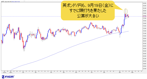 ところで、スコットランド独立問題で「塞翁が馬」となった英ポンド/円は高値を更新していたから、これは円売りモメンタムの強さの象徴的な存在だった。しかし、9月19日(金)のチャートから考えると、やはりすでに頭打ちしていた公算が大きい。
