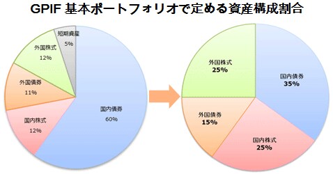 具体的には、基本ポートフォリオとして、国内債を60%→35%に減らし、その代わり、国内株式を12%→25%に、外国債を11%→15%に、外国株式を12%→25%に増やすというものです。
