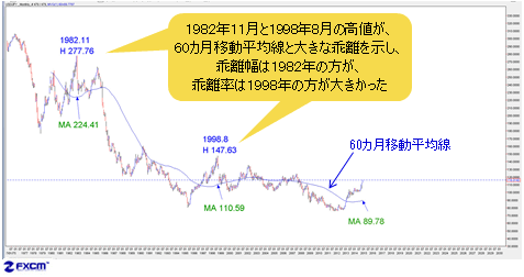 上のチャートが示すように、1982年11月と1998年8月の高値が、同移動平均線と大きな乖離を示し、乖離幅は1982年の方が、乖離率は1998年の方が大きかった。