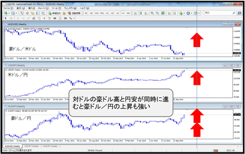 豪ドルは対円では100円台に復帰したが、対米ドルだと下落している。ということは、豪ドル/円は豪ドル高によって100円台へ復帰したのではなく、円安によって復帰したことになる。それが対米ドルでも上昇を始めれば、豪ドル高&円安のダブル効果で、米ドル/円よりも大きな上昇が見込める可能性があるわけだ。