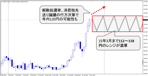 「来年、2015年に米ドル/円は115円と思っていたのですが、追加緩和が前倒しで達成されました。さらに、解散総選挙が報道されると、市場は円安で反応したこともあり、このまま一気に120円へと向かう可能性もゼロではありませんが、2015年3月までは1ドル112~118円のレンジでもみ合うのではないでしょうか」