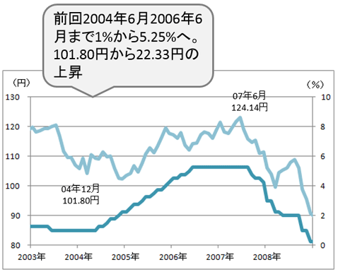 アメリカが前回、利上げに転じたのは10年前の2004年6月。1%から1.25%へと政策金利を引き上げると、2006年6月の5.25%まで金利を引き上げた。金利引き上げ前の安値が101.80円、引き下げ局面に転じる前の高値が124.14円。アメリカの金融政策転換で20円以上の円安が進んだ。