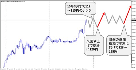 「今のところ、アメリカの利上げは2015年7月~9月にかけてとみています。その手前からイエレンFRB(米連邦準備制度理事会)議長をはじめとするFOMC(米連邦公開市場委員会)メンバーから利上げ予告的な発言が出て、米ドル/円は120円を目指すというのがメインシナリオです」