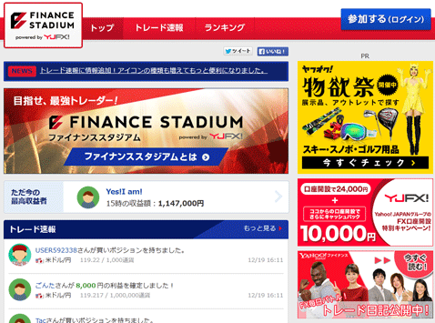 数多く開催されたトレードバトル的なイベントのなかで、特に注目しておきたいのは、常設コンテンツ型のトレードバトルで、2014年3月末に始まったYJFX!「外貨ex」の「ファイナンススタジアム」。