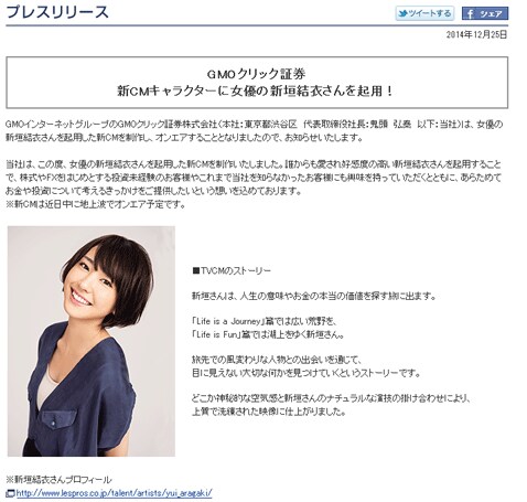 GMOクリック証券が人気女優の新垣結衣さんを起用!