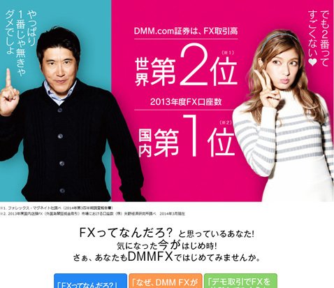 2013年のFX取引高世界第1位のGMOクリック証券に対して、第2位に輝いたDMM.com証券は、これまで2位を前面に押し出したコミカルなCMを展開してきました。