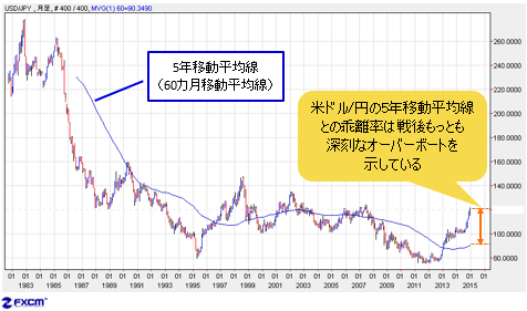また、よく使われる5年移動平均線との乖離率で見ると、122円の節目手前に一時迫った米ドル/円は、戦後もっとも深刻なオーバーボート(米ドルの買われすぎ・円の売られすぎ)の状況を示し、その延長線で来年(2015年)の相場を図らないといけない。