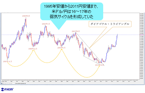 下に掲載した米ドル/円の月足を見ればわかるように、1995年安値から2011年安値まで、米ドル/円は16~17年の弱気サイクルを形成していた。