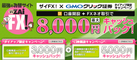 今なら、通常の新規口座開設キャンペーンに加えて、お得なザイFX!限定タイアップキャンペーンも実施中です。