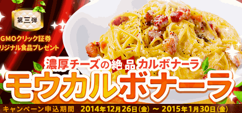 そんなGMOクリック証券では、今なら『パスタもセット!濃厚「モウカルボナーラ」プレゼントキャンペーン』を実施中!