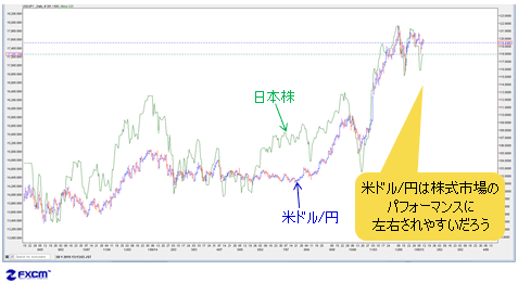米ドル/円の場合、アベノミクス以降、日経平均との連動性を強めてきたので、まず、株式市場のパフォーマンスに左右されやすいだろう。