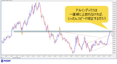 ドルインデックスは、下のチャートのとおり、重要な分水嶺を試しているが、一直線に上放れなければ、いったんスピード修正してこよう。